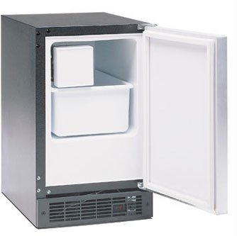 #Marvel White Built In Ice Maker 15IMWWFR. Produces up to 12 lbs. of ice per day. Stores 15 lbs. Half moon style ice cubes. Manual defrost. No drain required. Ice Production: 12 Lbs. Per Day. Storage: 15 Lbs. Ice Cube Type: Half Moon Style. Defrost: Manual. Field Reversible Door: No. Drain Required: No. Width: 14 7/8. Depth: 22 1/8. Height: 24 1/4. Weight: 72 Lbs. At Marvel, they believe that confining refrigeration to the kitchen is like keeping a fine wine bottled forever. Your lifestyle simply demands more: more choices, more elegance, more quality. That's why they are proud to offer the industry's finest line of luxury undercounter refrigeration products, which free you to design refrigeration into any room. So, like a fine bottle of wine, open up and savor the features, quality and design Marvel pours into every product. At . Ice Machines Ice is a necessity for entertaining, and thanks to Marvel, you can have sparkling ice-in crescents or cubes-wherever and whenever you need it. Marvel also offers design innovations such as doors that accept overlay panels to match surrounding cabinetry, so the look of your room never takes a back seat to your need for elegant entertaining.