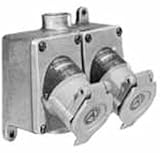 | ✚✚✚ Class 1 Div 1 and Class 2 Div 1 - 2 Gang Outlet Box(-Dead End) Class 1 Div 1 and Class 2 Div 1 - 2 Gang Outlet Box(-Dead End). The Magnalight EPO-2G-40A explosion proof power gang outlet provides durable and secure, weatherproof, multiple power connections for portable or stationary electrical devices and equipment in locations where equipment is susceptible to wet and corrosive environments.This 2 gang power receptacle is ideal for operators seeking a high quality, wet area rated power receptacle suitable for use in industrial and manufacturing applications. This unit's power receptacles are constructed of copper free aluminum and the housings are malleable iron. The unit is factory sealed and any arcing is safely contained with the interior of the receptacles. The receptacle contacts are deep recessed to avoid accidental contact and will accept standard non explosion proof plugs that are NEMA 5-20R, or 6-20R compatible although explosion proof plugs must be used to preserve explosion proof approval in hazardous environments. Ordinary location plugs will NOT activate these explosion proof receptacles. The iron housings are finished in a triple-coat zinc electroplate, chromate and epoxy powder coat while the receptacles are finished with an expoxy powder coat. This unit is designed to withstand wet and corrosive conditions such as those found in docks and shipyards and comes with spring loaded receptacle doors to prevent ingress of water and contaminants when the unit is not in use. Click Photo to Enlarge Click Photo to Enlarge Click Photo to Enlarge The EPO-2G-50A 2 gang power receptacle is constructed of non sparking aluminum and finished with an epoxy powder coating while the housing is constructed of triple coated malleable iron for durability and added corrosion resistance. The internal receptacle plug contacts are constructed of brass and designed to maintain constant pressure along their entire length for superior connectivity.