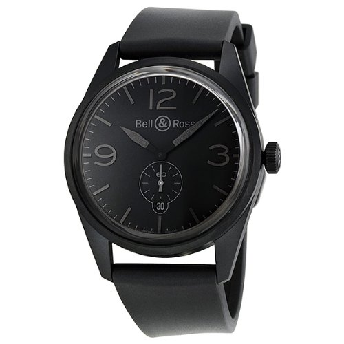 #Black PVD stainless steel case with a black rubber strap. Fixed black PVD bezel. Black dial with grey hands and index hour markers. Arabic numerals mark the 3, 9 and 12 o'clock position. Minute markers around the outer rim. Dial Type: Analog. Luminescent hands and markers. Date display at the 6 o'clock position. Seconds sub-dial above the 6 o'clock position. Mechanical movement. Scratch resistant sapphire crystal. Solid case back. Case diameter: 41 mm. Round case shape. Band width: 20 mm. Tang clasp. Water resistant at 100 meters / 330 feet. Functions: date, hour, minute, second. Dress watch style. Watch label: Swiss Made. Bell and Ross Vintage Phanto Black Dial Mens Watch BRV123-PHANTOM.