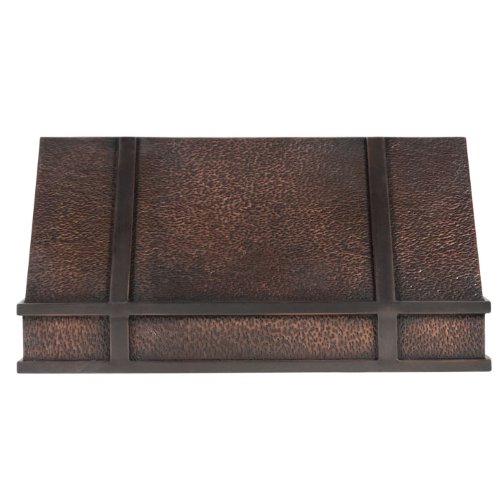 #Freshen up the air and style of your kitchen with this wall mount range hood featuring a hand-hammered texture and accent bands. Made of solid copper this range hood includes two dimmable lights to illuminate the entire cooking surface. Made of 16 gauge copper. 30 L x 24 W (front to back) x 18 H (± 1/2 ). Opening at top of flue measures 25 L x 8 W (front to back). Flue has open back. Range hood inserts are made from high quality 304 grade stainless steel. Exterior vent through roof or wall using 8 diameter metal pipe (not included). Contains two dimmable 50-watt halogen light bulbs to illuminate both sides of the stovetop. 120 volts. 60 Hz. Two reusable, dishwasher safe stainless steel baffle filters. Insert available with or without in-hood fan. Without Fan: You must use with a remote or in-line fan. Variable speed fan control. With Fan: In-line blower features a 2.99 amp motor and delivers air flow up to 836 CFM. Sound rating of approximately 7 sones. UL listed. Inserts are made in the USA. Hood only option available.